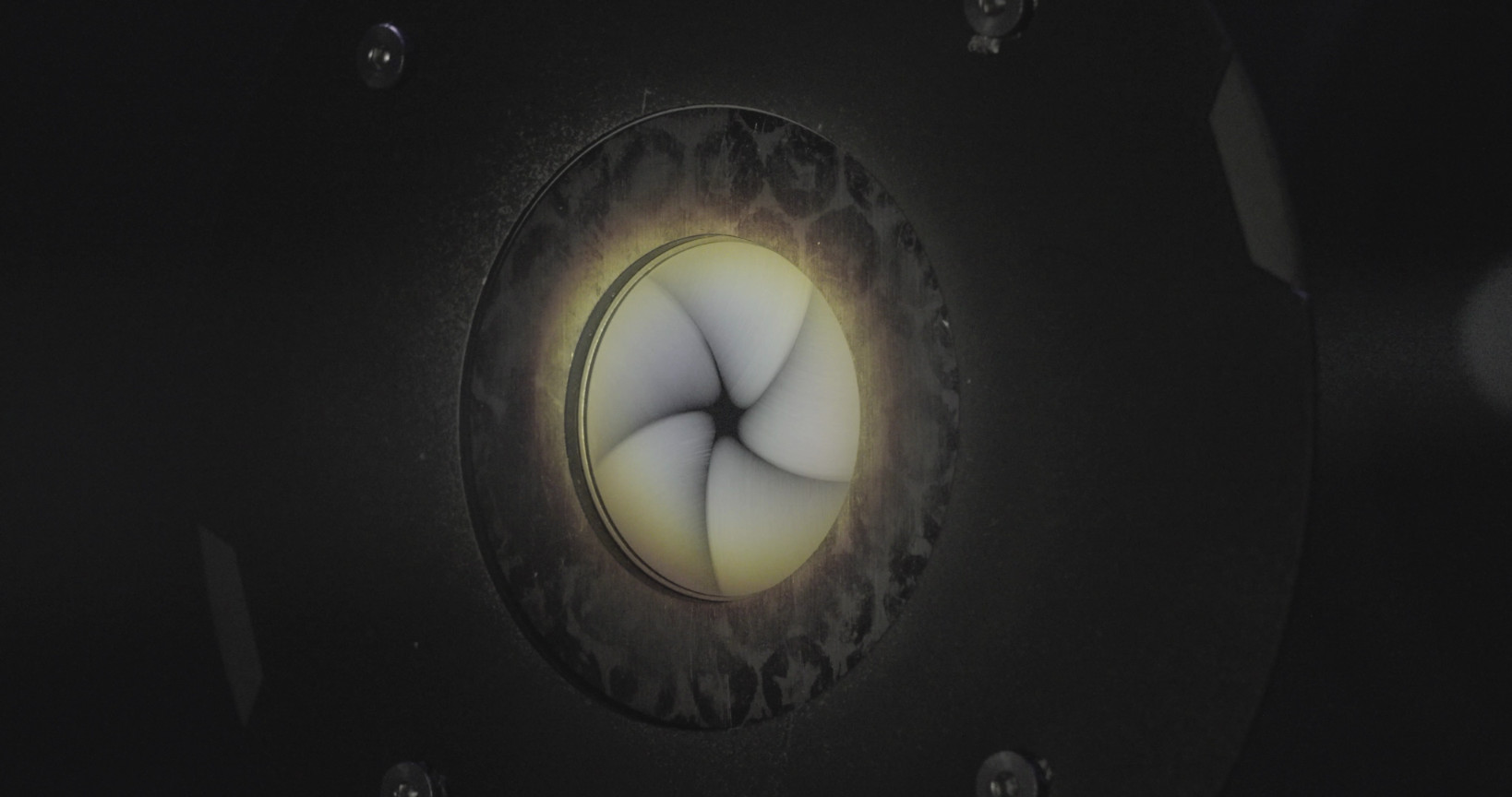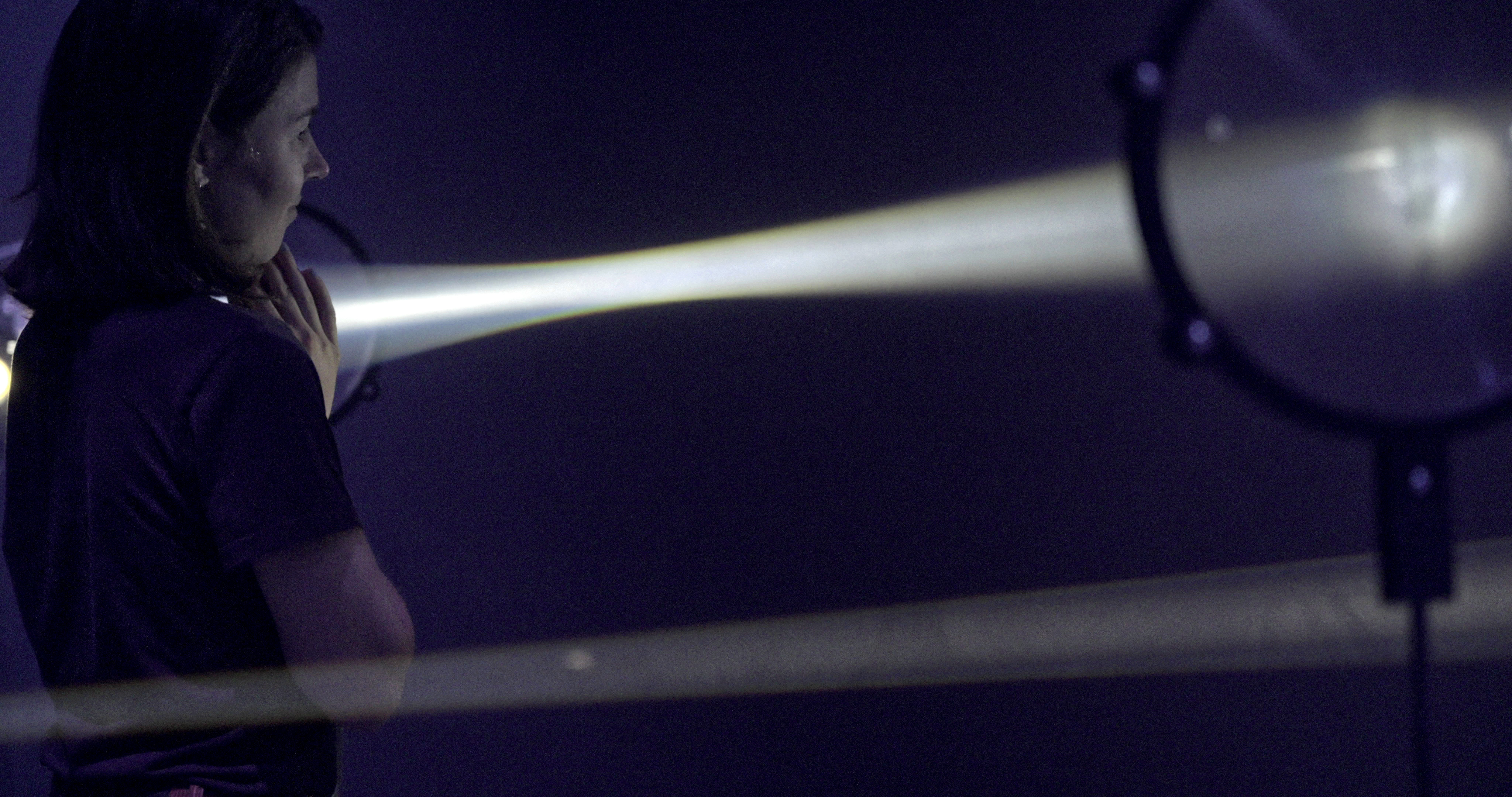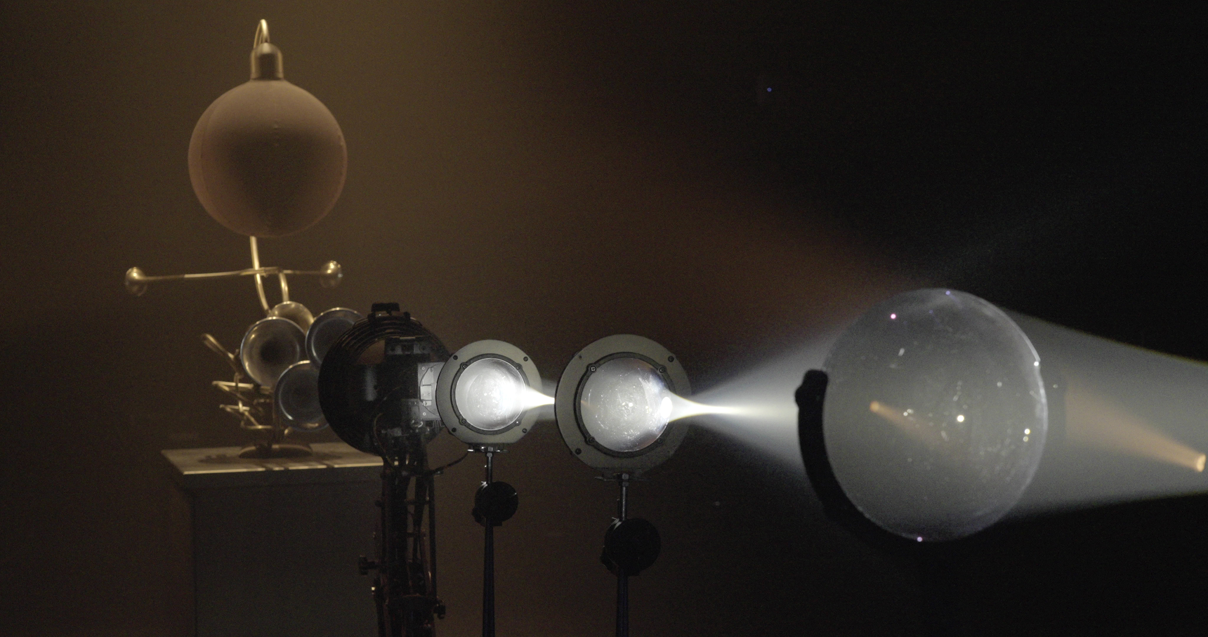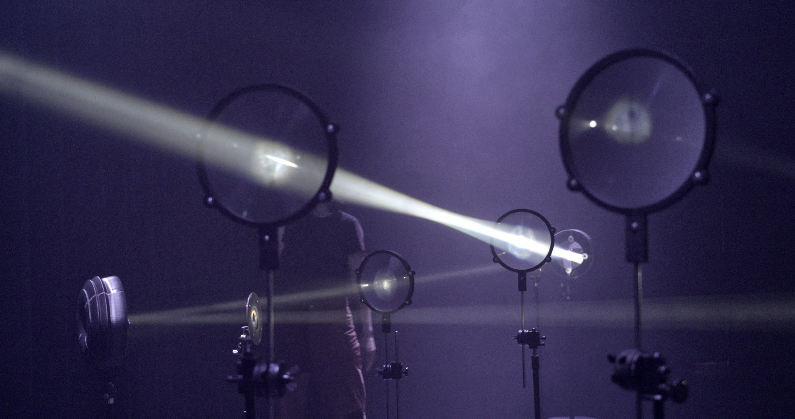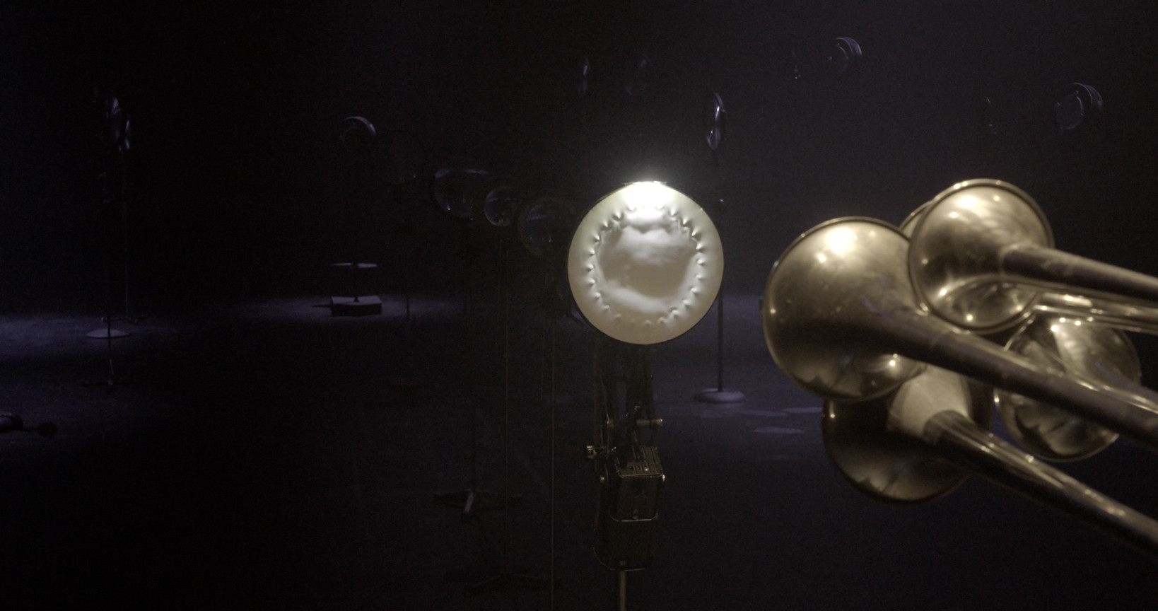 The valves open. Airborne voices are forced through a series of reflective steel cornets towards an elastic membrane where mechanically induced friction compels the collected voices to incandesce. Behind the pulsating membrane, an iris opens, slowly releasing the luminous voices towards a series of glass lenses and mirrors. From here follows a five-part choral harmony of mirrors that builds into a final cacophonous performance of rhythm and light.