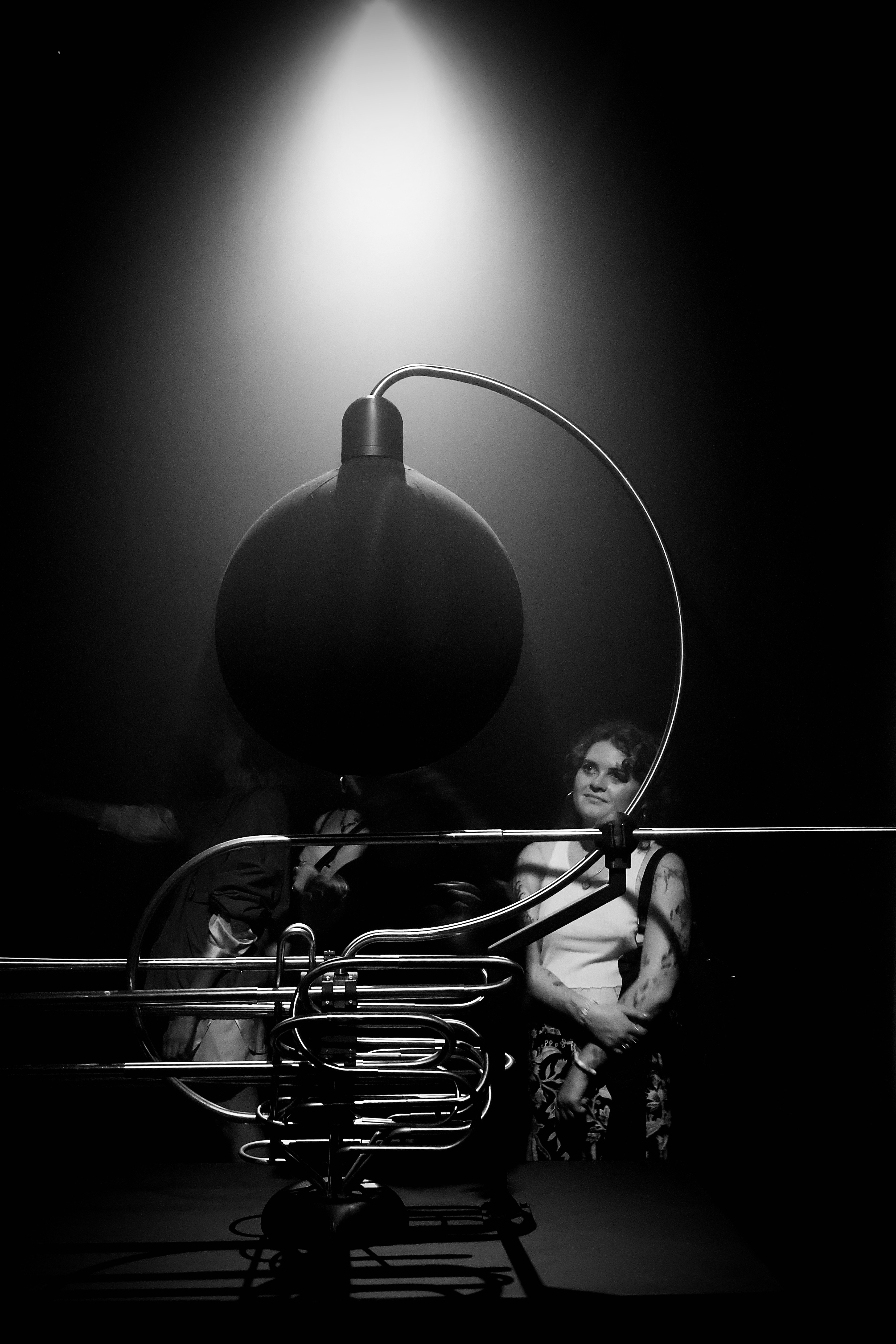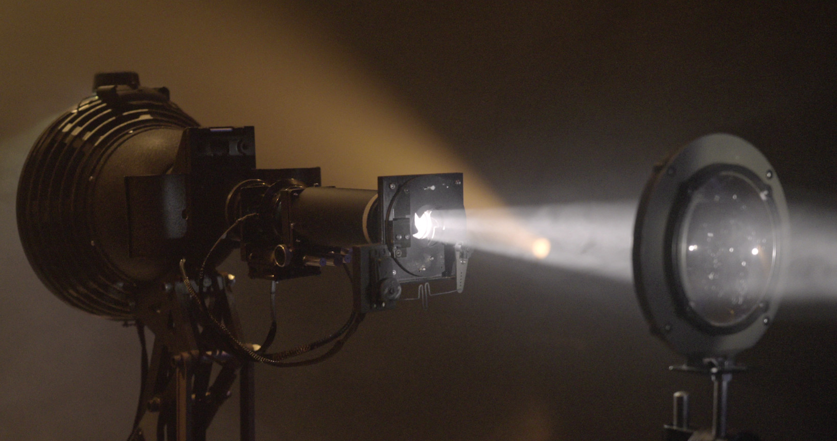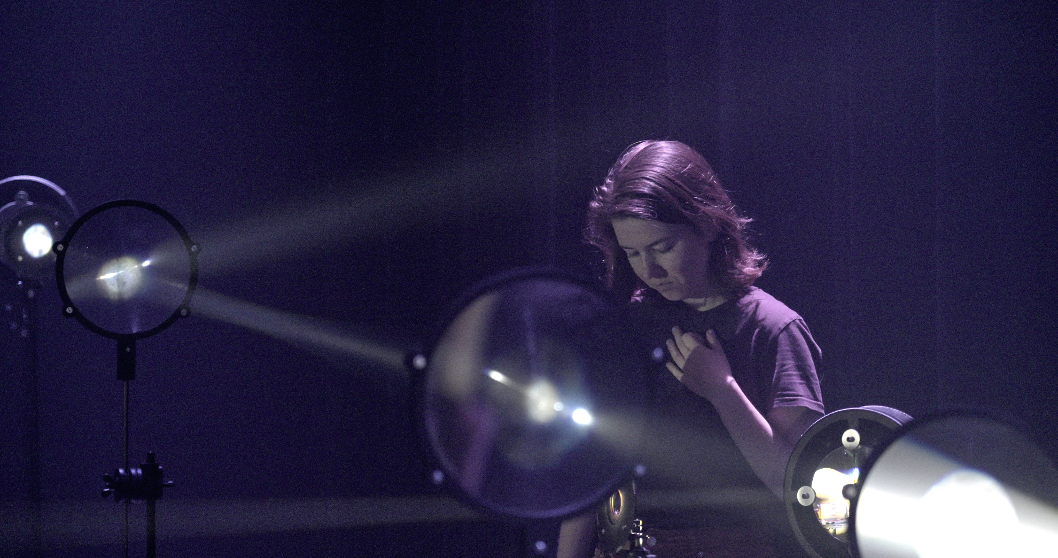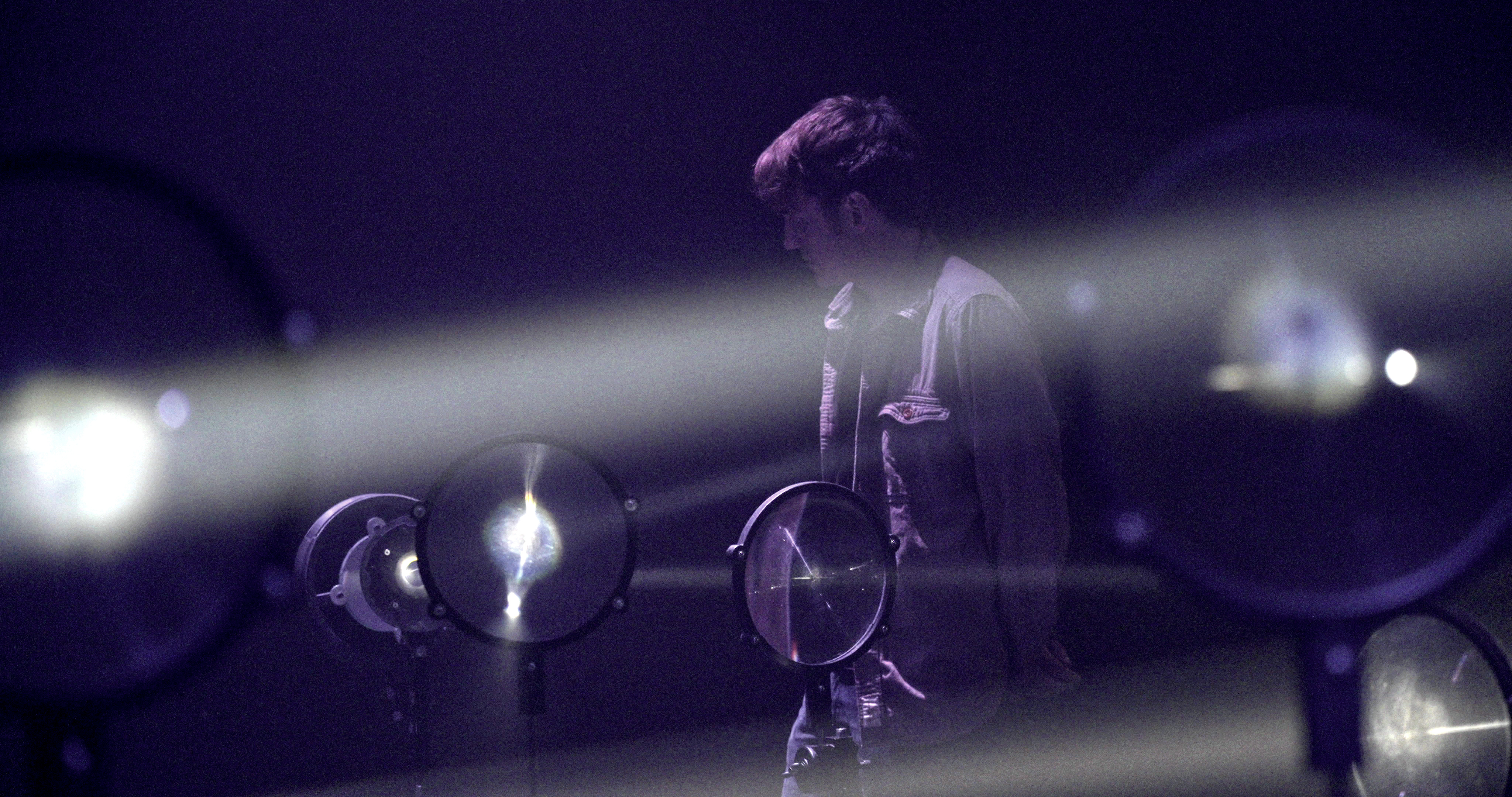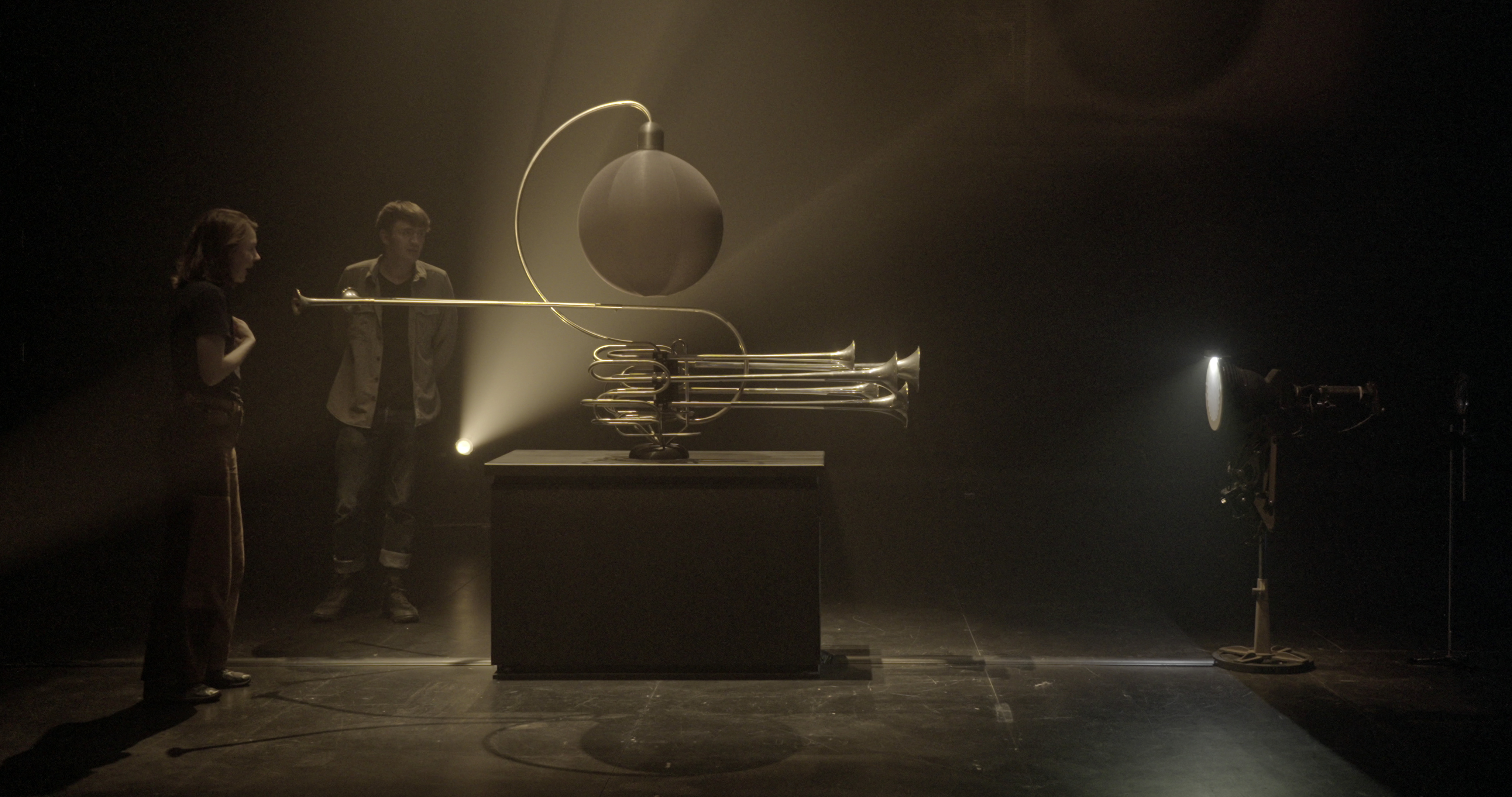 The valves open. Airborne voices are forced through a series of reflective steel cornets towards an elastic membrane where mechanically induced friction compels the collected voices to incandesce. Behind the pulsating membrane, an iris opens, slowly releasing the luminous voices towards a series of glass lenses and mirrors. From here follows a five-part choral harmony of mirrors that builds into a final cacophonous performance of rhythm and light.