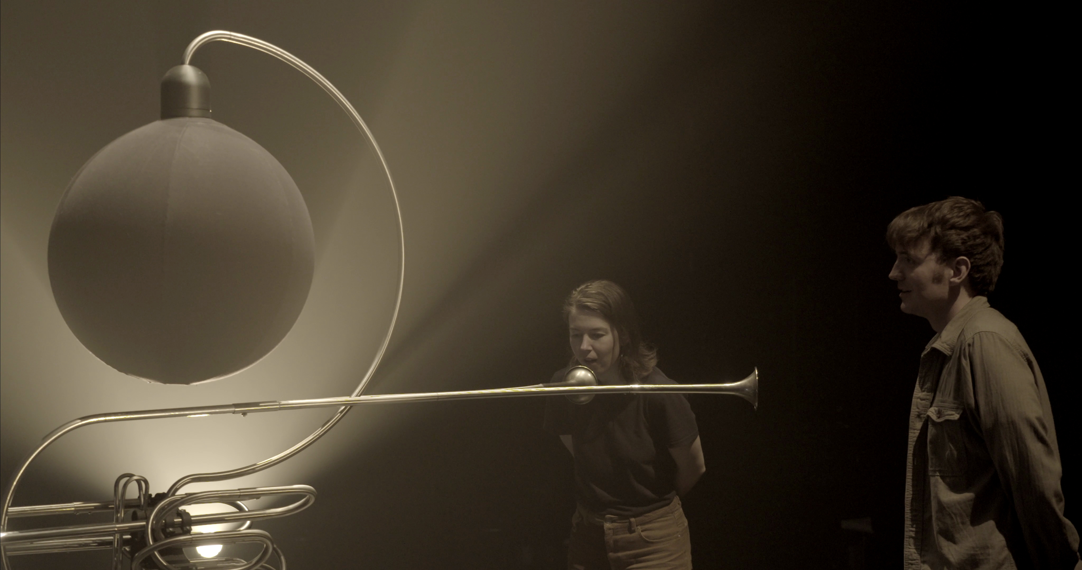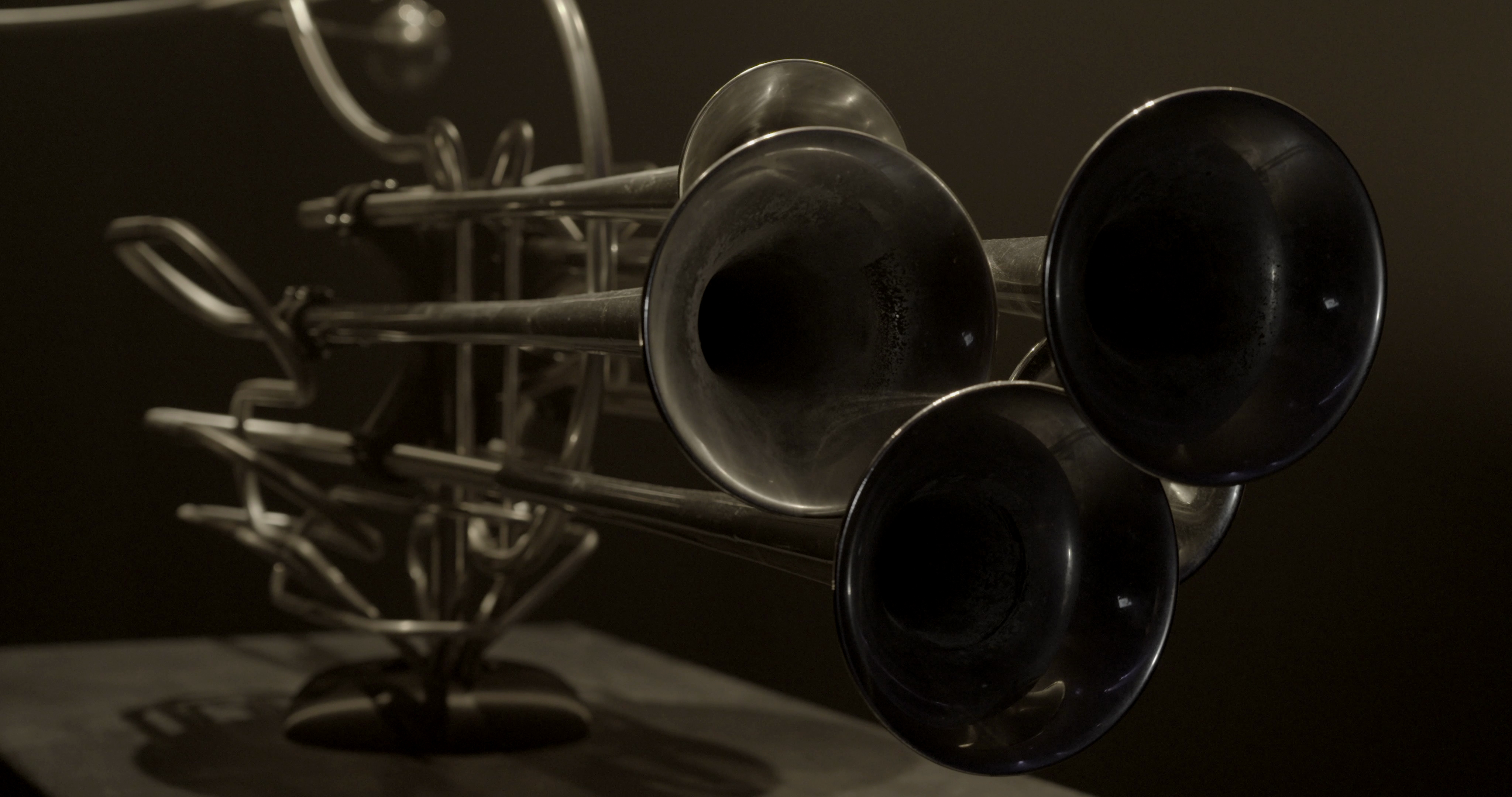 The audience speaks into the bells of two horns. Sound is inhaled into an alchemical apparatus. The collected voices become chaotically entangled within the tensile confines of an expanding latex balloon. Trapped inside the captured aether words collide, fragment, and recombine, modulating their contextual and phonetic arrangement. A soundscape of ricocheting voices is perceived, emerging from deep inside the balloon. Over time, the pressure becomes too great and like a sonic capacitor, sound is freed from its reservoir.